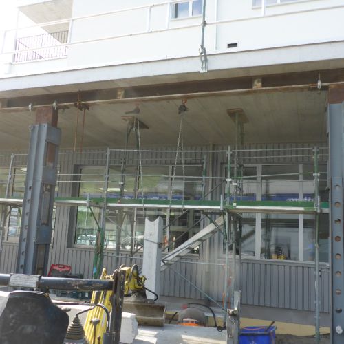Rückbau der bestehenden Betonstützen, Neubau Unterzug und Betonstützen.