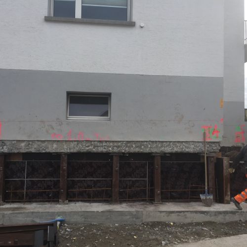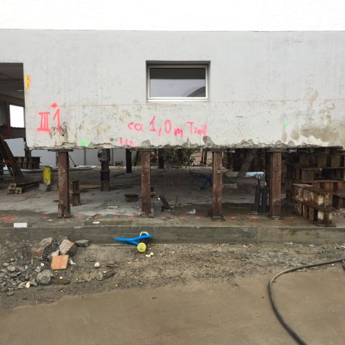 Ausgerichtet und zusätzlich ca. 60 cm angehoben mit Einbau neuer Bodenplatte.